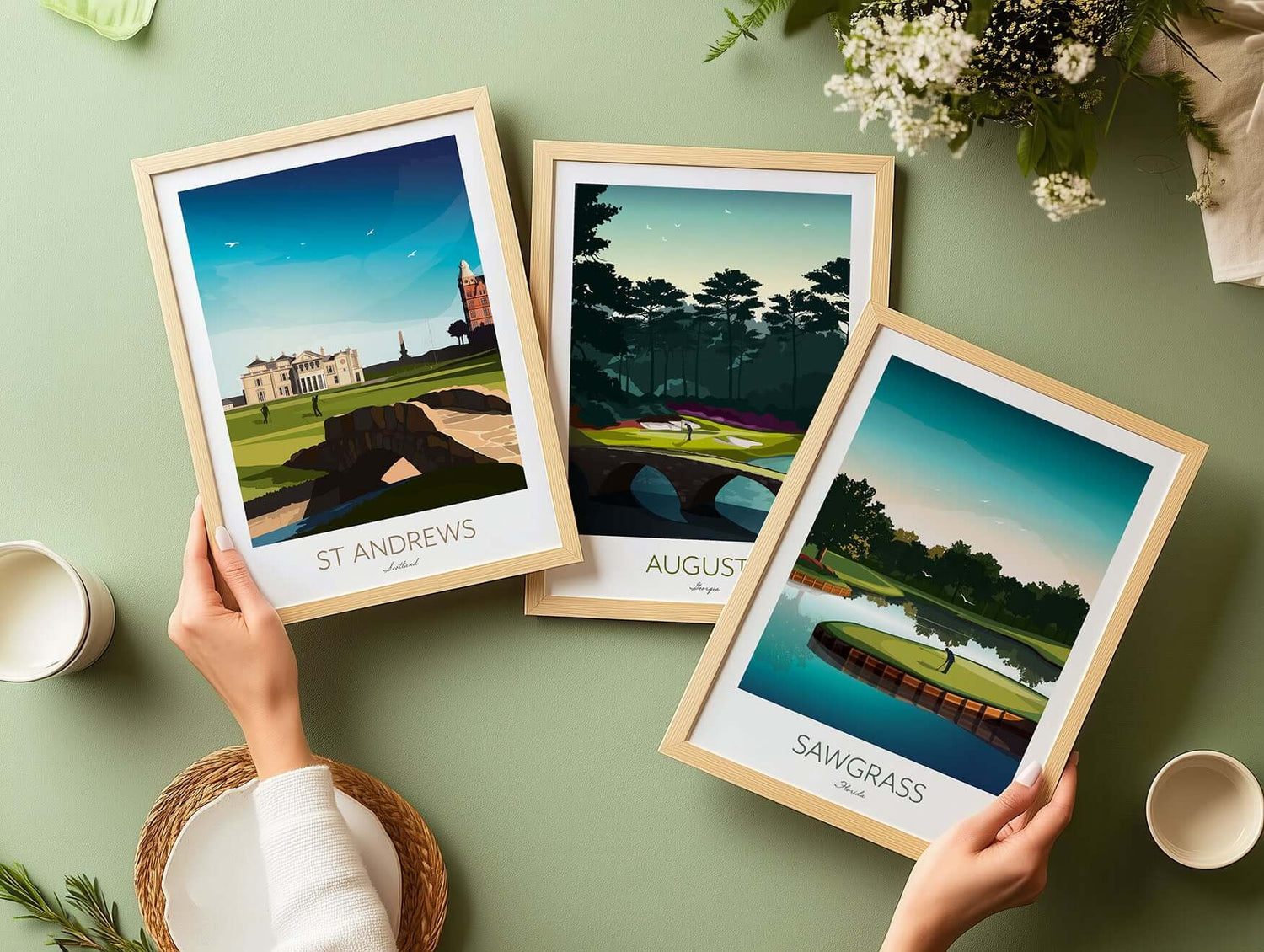 Golf art featuring world-famous courses turns any home into a haven for golfers. Prints of Augusta National’s iconic azaleas or Pebble Beach’s stunning views capture the essence of the game and evoke cherished memories. Each piece invites conversation and transports you to the fairway, celebrating the beauty of golf and moments spent with friends.