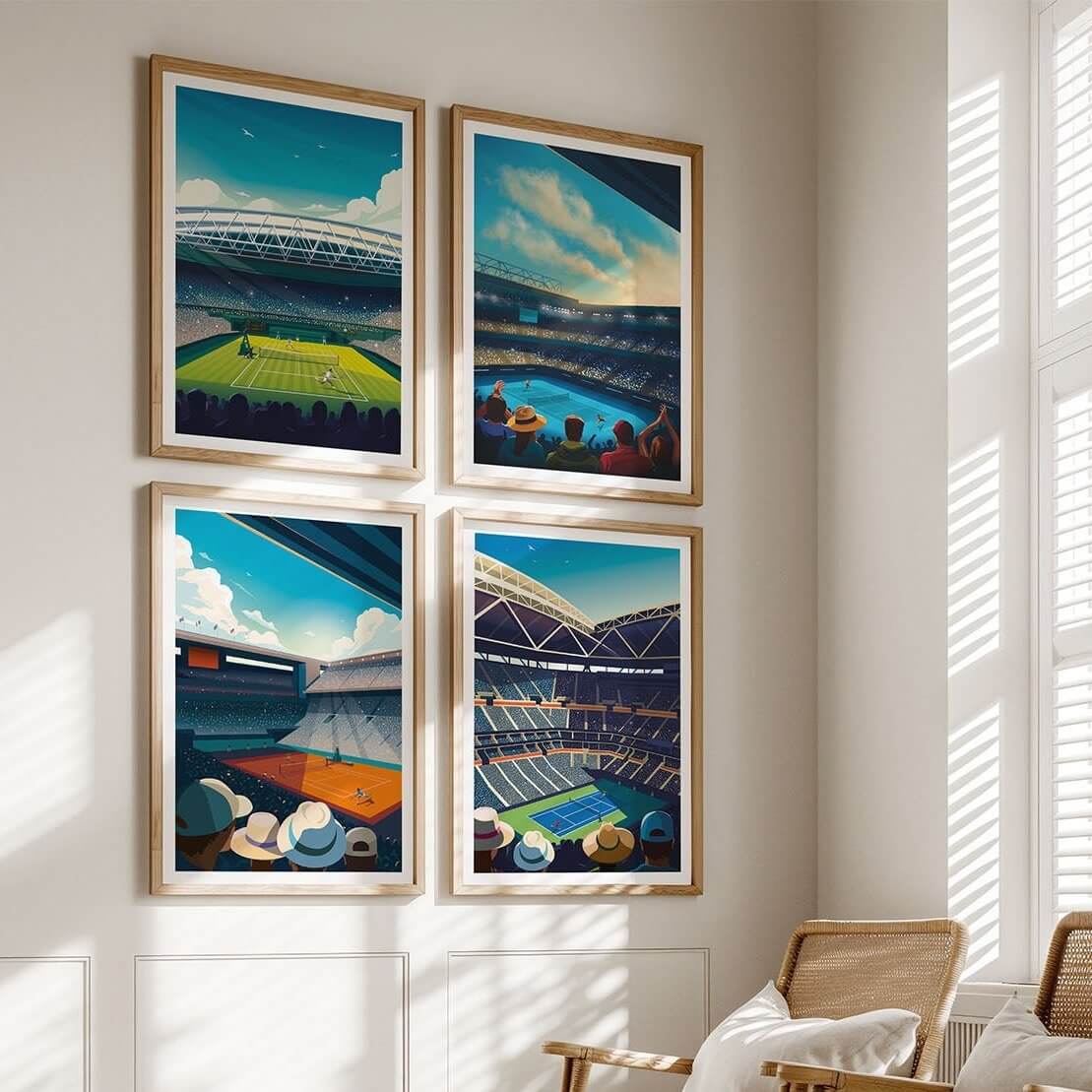 Tennis prints are ideal for both enthusiasts and sports fans, offering a stylish and meaningful addition to any home office, bedroom or living room. Art inspired by vintage tennis posters and infused with contemporary design and bold colors. From the red clay courts of Roland Garros, the lush green lawns of Wimbledon, to the sun-soaked courts of the Australian Open and US Open.