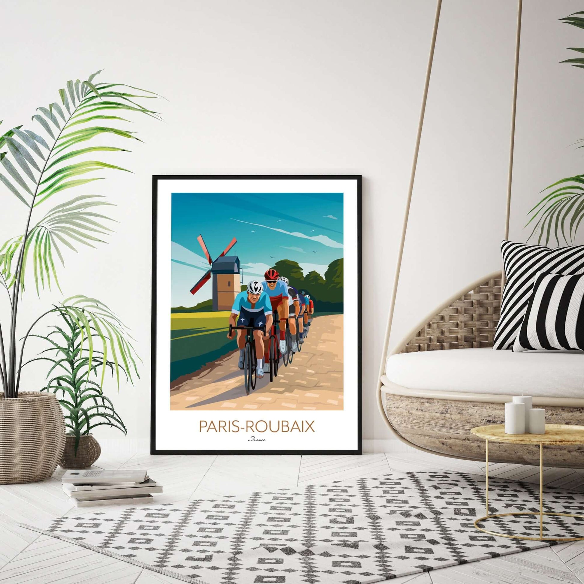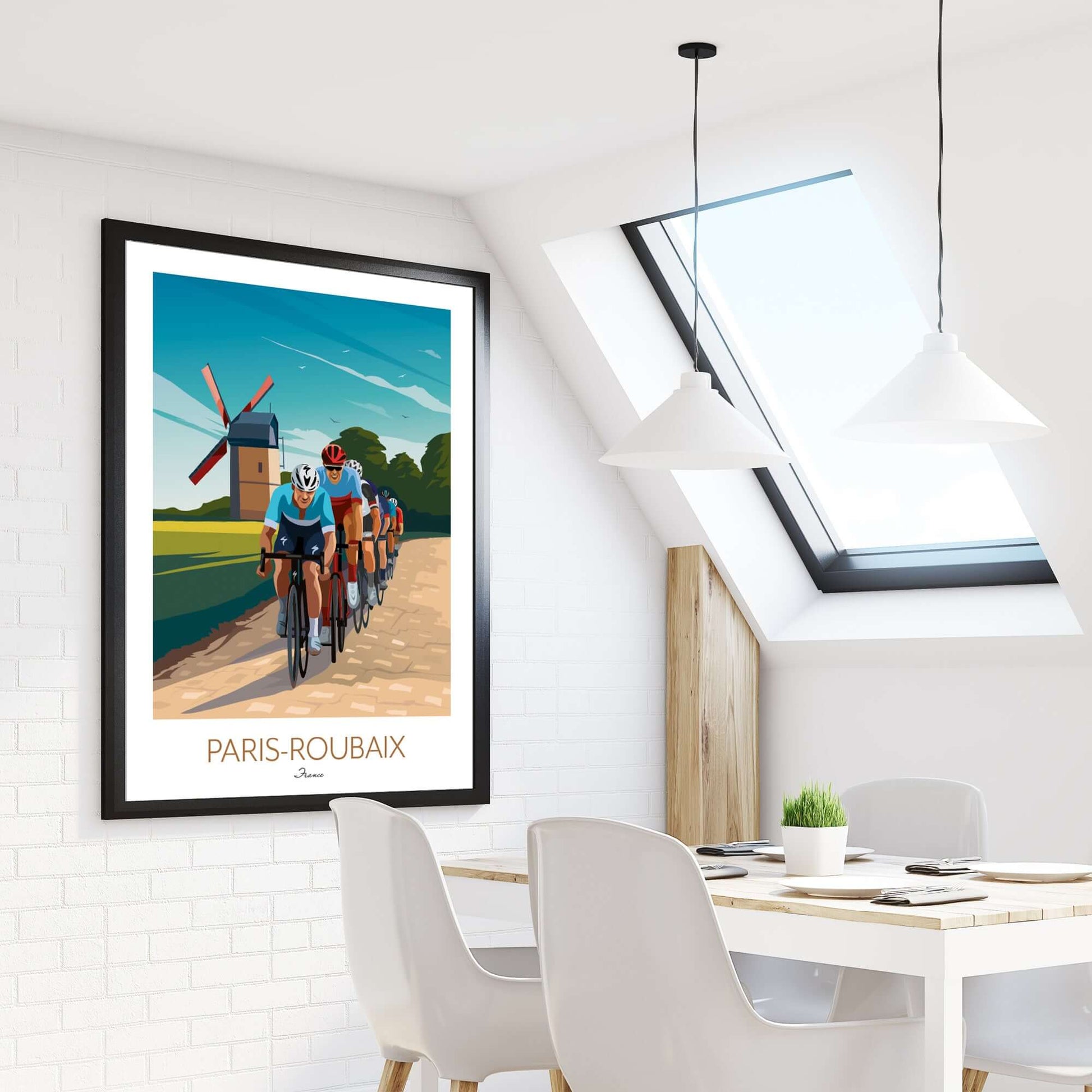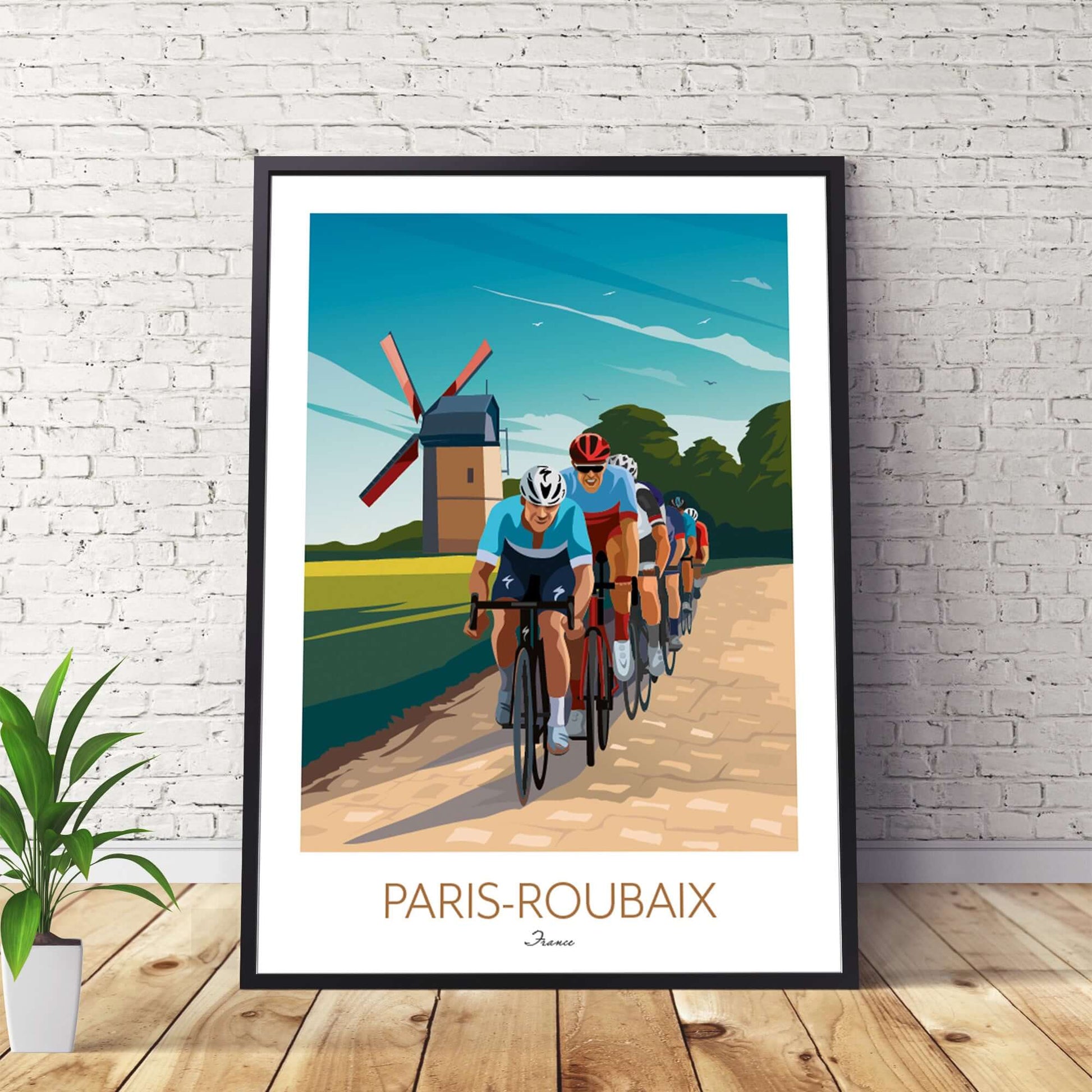 If you're searching for Paris Roubaix posters for sale or unique cycling wall art to buy, this Paris Roubaix print offers a striking depiction of the cobblestone battle and traditional French countryside. Perfect for anyone looking to enhance their space with premium cycling wall decor that celebrates the sport’s toughest race.