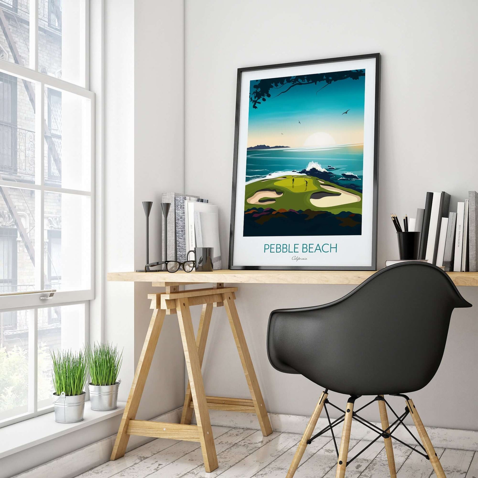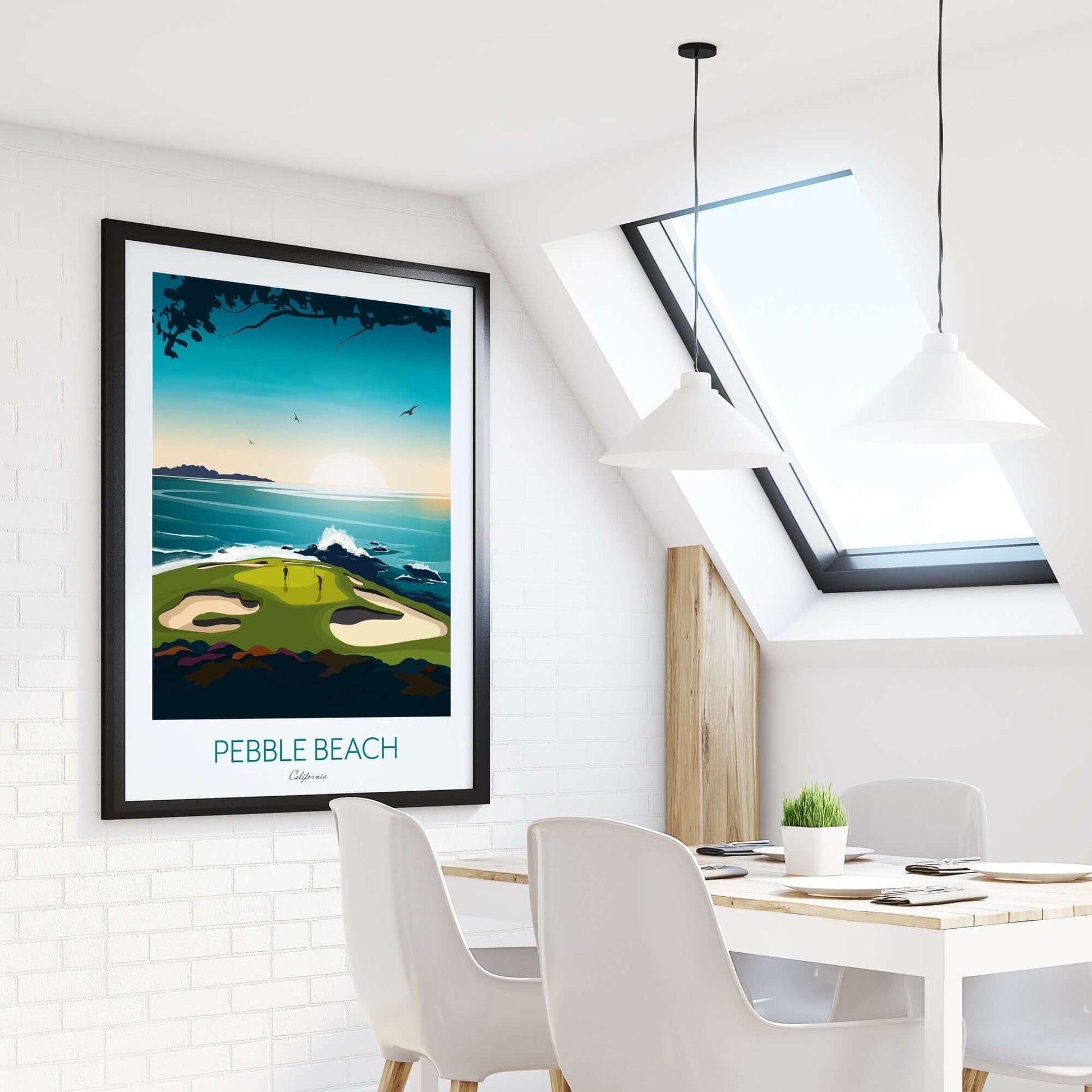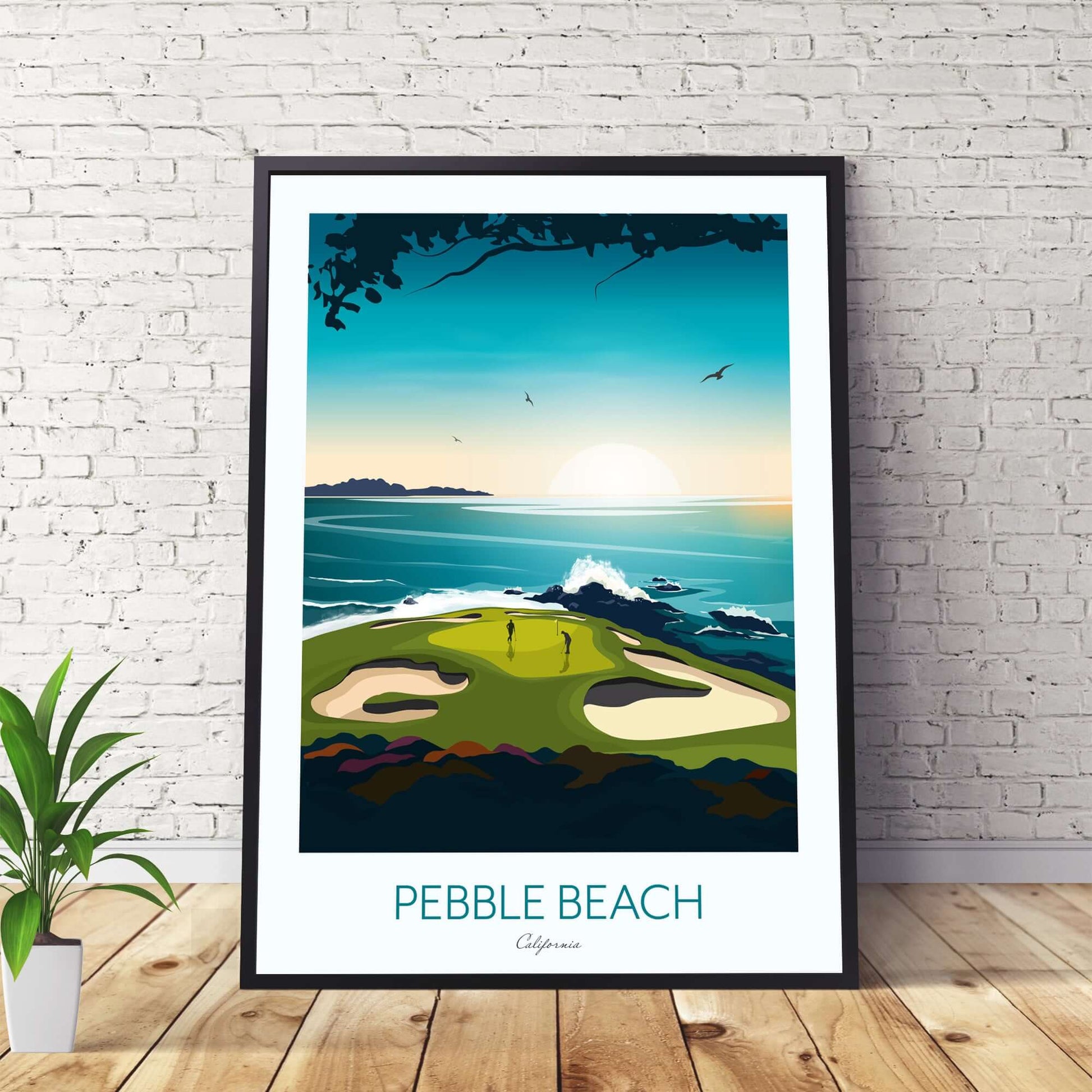This unique and dramatic golf print of Pebble Beach California, captures the essence of one of the most celebrated golf courses in the world. Nestled along the stunning California coastline, Pebble Beach is renowned for its dramatic ocean views, challenging holes, and rich history in the sport. This vibrant print features a contemporary design that brings the course to life with bold colors and dynamic details, perfectly showcasing the iconic cliffs and lush fairways. Whether you're an avid golfer or simply appreciate the beauty of the game, this artwork serves as a stunning tribute to the allure of Pebble Beach, making it a captivating focal point for your home or office.